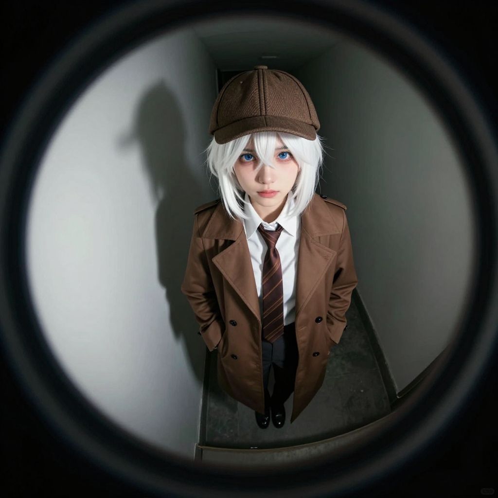 Masterpiece, newest, best quality, absurdres, extreme detail description, (fisheye:1.4), Seeing 1girl through the peephole, detective, solo, blue eyes, white hair, hair between eyes, brown coat, black trousers, hands in pockets, deerstalker hat, brown necktie, dark corridor, gradient background, close-up, foreshortening, cinematic angle