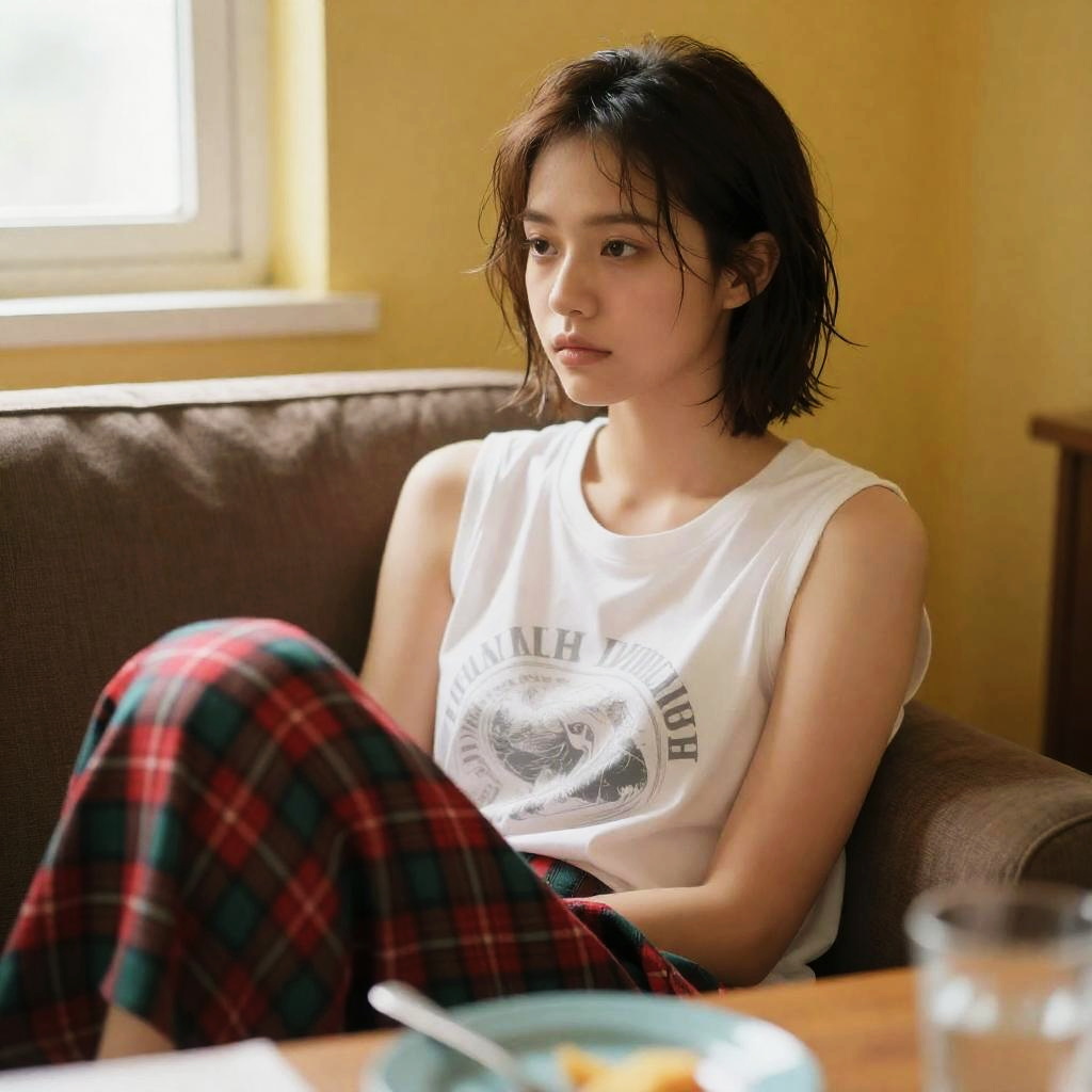 Young woman with short, wet-looking brown hair sitting on a brown couch, wearing a white sleeveless shirt with a graphic design, and a red and green plaid blanket. She looks to the side with a neutral expression. Background includes a yellow wall and a window with sunlight. Foreground has a blurred table with a blue plate and other items.