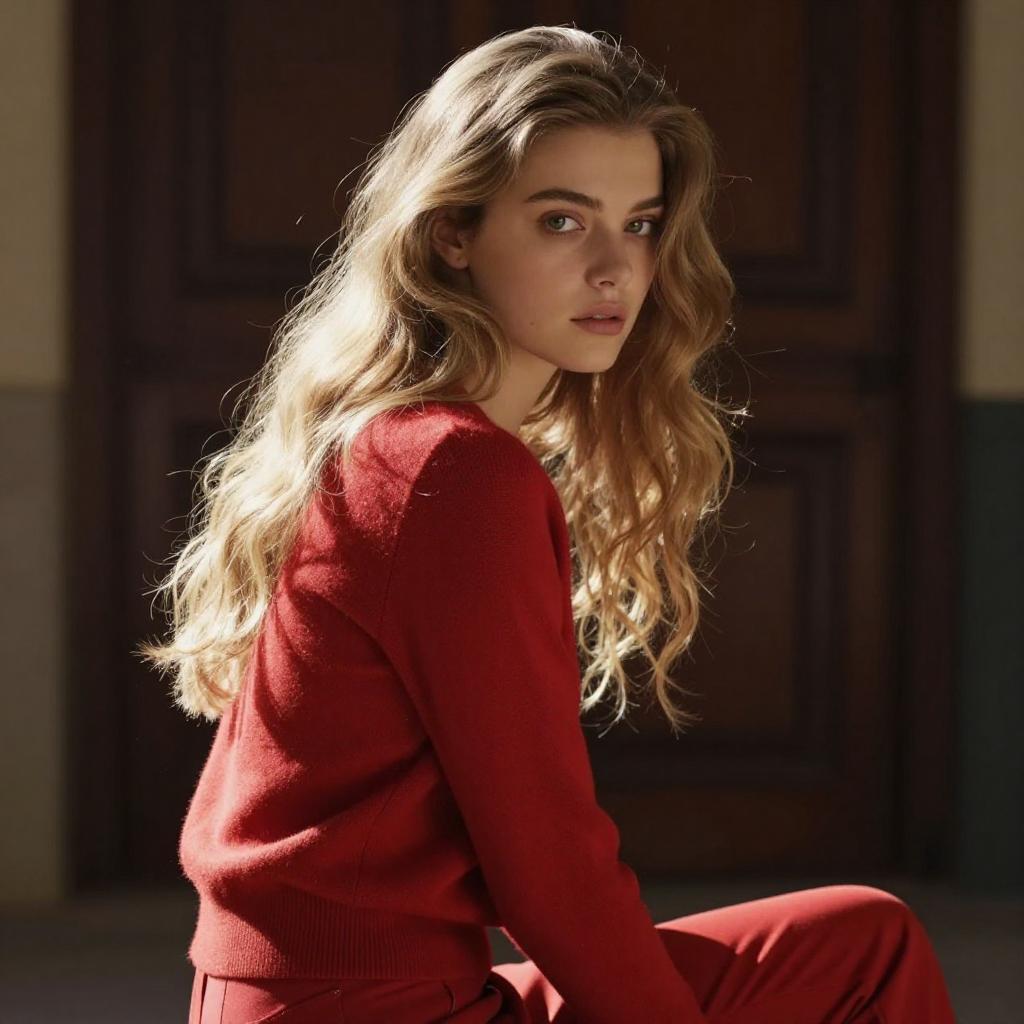 Photograph of a young woman with long, wavy brown hair, wearing a vibrant red, lace long-sleeve dress. She is lying on her stomach, propped up on her elbows, with a soft, warm light illuminating her face and dress. Her expression is relaxed and slightly seductive. The background is a simple, gradient gray.