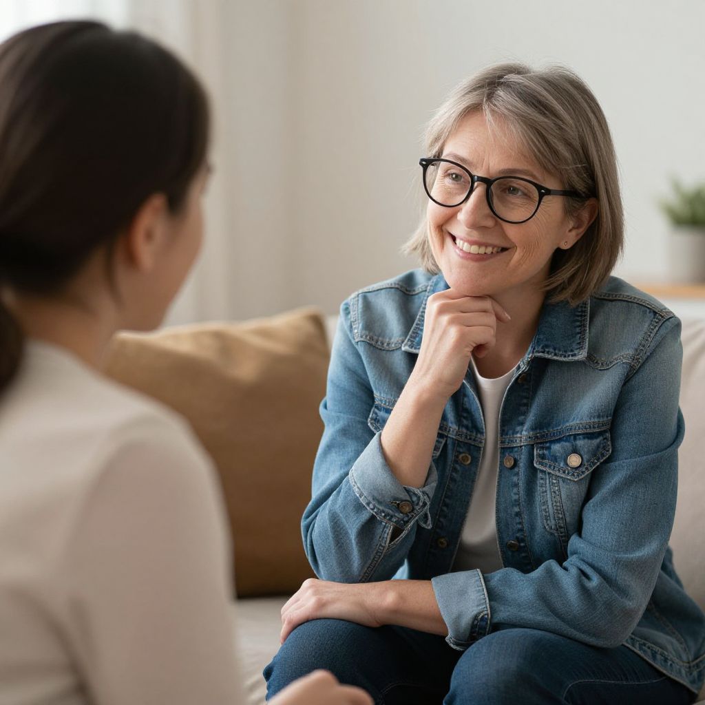Two individuals engage in a heartfelt conversation, with an older woman wearing glasses and a denim jacket smiling warmly while resting her hand on her chin, seated across from another person in a cozy indoor setting.
