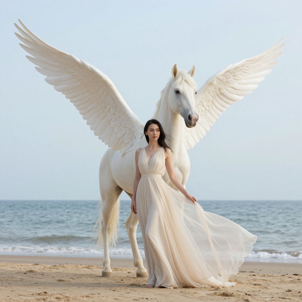 Ethereal woman in flowing cream gown stands gracefully beside a majestic winged horse, its wings spread wide against the serene backdrop of a sandy beach and calm ocean.
