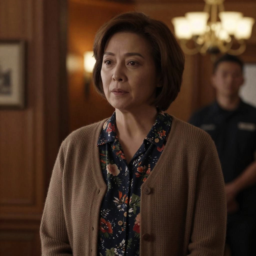 Middle-aged woman with curly gray hair, smiling slightly, wearing a brown cardigan and patterned blouse, wooden chair in background. Dimly lit room, soft shadows. Woman centered, chair to left.