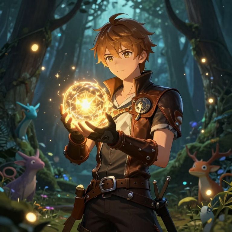 Anime-style digital artwork of a brown-haired young man in a forest, holding a glowing magical orb, surrounded by enchanted creatures and glowing lights.