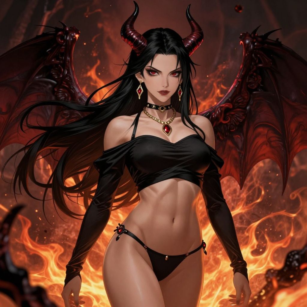 The image depicts a strikingly beautiful Satan woman in an anime-style illustration. She has long, flowing black hair cascading down her back, adorned with a gold necklace and earrings that add a touch of elegance to her appearance. Her body is adorned with a black, off-the-shoulder top that reveals her muscular and fit physique, accentuated by a red gemstone necklace and a black thong. The woman's horns, a prominent feature of her demonic nature, protrude from her head, adding to her intimidating presence. Surrounding her are flames and dark, twisted wings, enhancing the sense of power and danger. The overall color palette is dominated by dark tones, with red and orange hues from the flames and wings creating a stark contrast against the woman's skin and black attire. The composition is dynamic, with the woman positioned centrally, drawing the viewer's attention to her powerful and seductive figure.