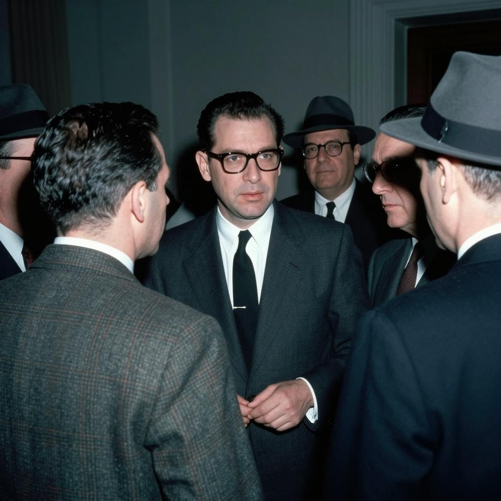Vintage photograph featuring several men dressed in mid-20th century formal business attire including dark suits, ties, and hats. The central figure wears a dark suit with a white shirt, black tie, and glasses, looking directly forward with an intense expression. Surrounding men are similarly dressed with some wearing hats and glasses. The setting is an indoor space with dim, blue-green lighting.