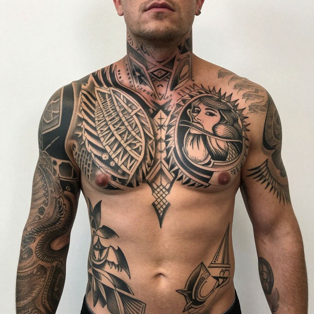 A heavily tattooed man with intricate black ink designs covering his chest, arms, and neck, posing confidently against a plain background. The tattoos feature a mix of geometric and illustrative styles, showcasing detailed craftsmanship.