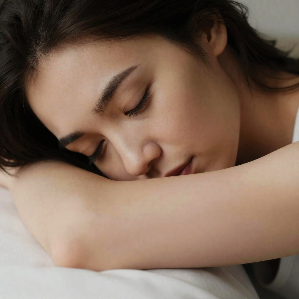 Photograph of a person with light brown hair, lying in bed, partially covered by a white, crumpled sheet. Face partially visible, eyes closed, neutral expression. Background includes a blurry, dark-colored wall art piece. Soft lighting.
