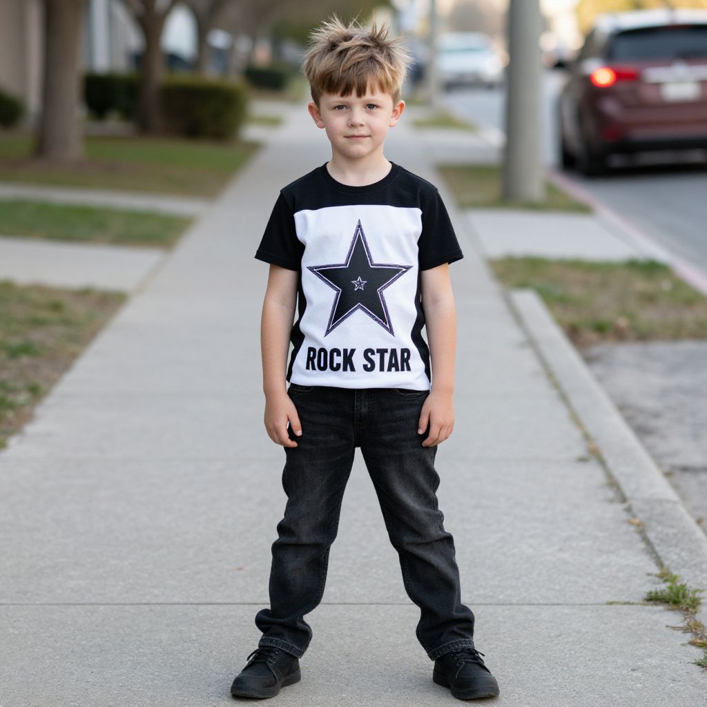 Rock Star Costume Boy, boy with a messy haircut standing on a sidewalk