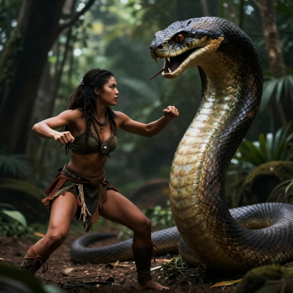 Realistic photo.Very dark focused flash photo, amazing quality, masterpiece, best quality, hyper detailed, ultra detailed, UHD, perfect anatomy, portrait, dof, hyper-realism, majestic, awesome, inspiring, Capture the thrilling showdown between the beautiful female jungle warrior and the colossal jungle serpent beast in an epic battle amidst the jungle. Embrace the action and chaos as these formidable forces clash. cinematic composition, soft shadows, national geographic style, extremely detailed, dark, chiaroscuro, low-key, Bosstyle realistic photo