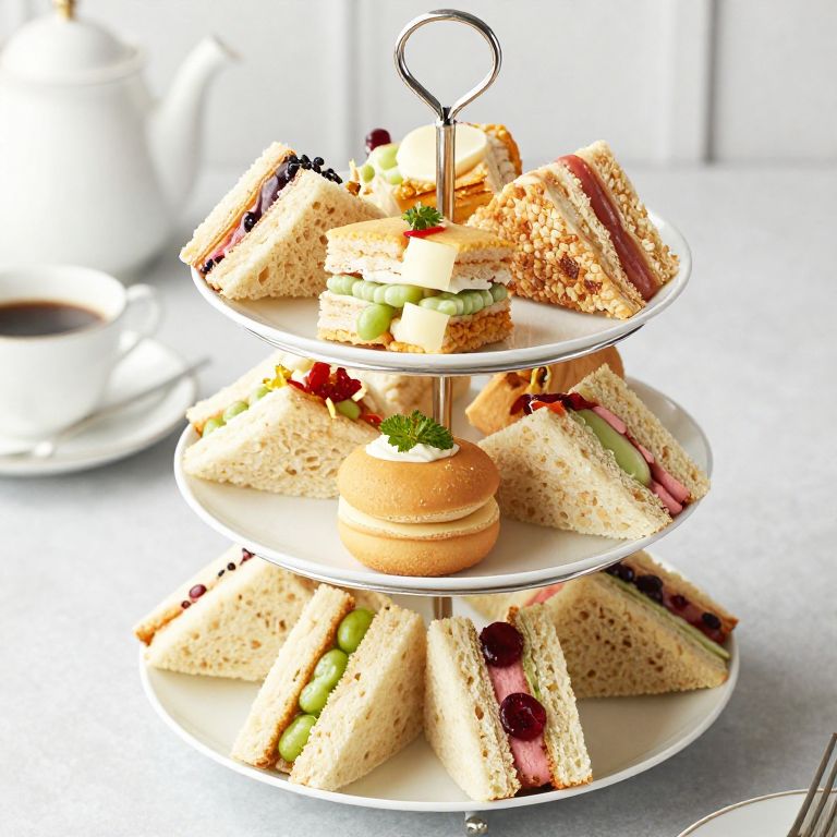 Photograph of a three-tiered white stand holding assorted sandwiches with fillings like cucumber, ham, and cheese, topped with a small macaron.