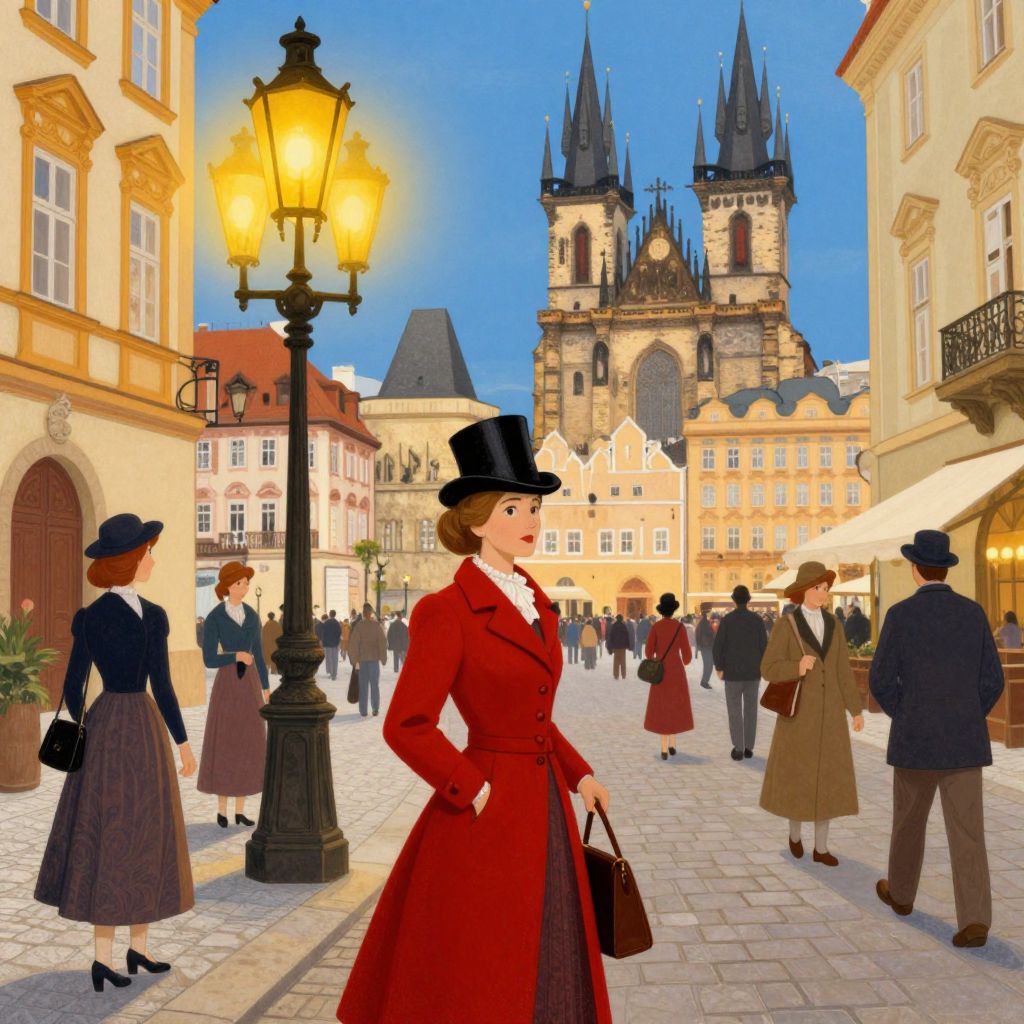 A vibrant illustration reminiscent of Jan Minařík's style depicts a bustling street scene in Old Prague, featuring a woman in a red coat and top hat carrying a bag, surrounded by pedestrians in period attire, under the warm glow of vintage street lamps against a backdrop of yellow buildings and a clear blue sky.