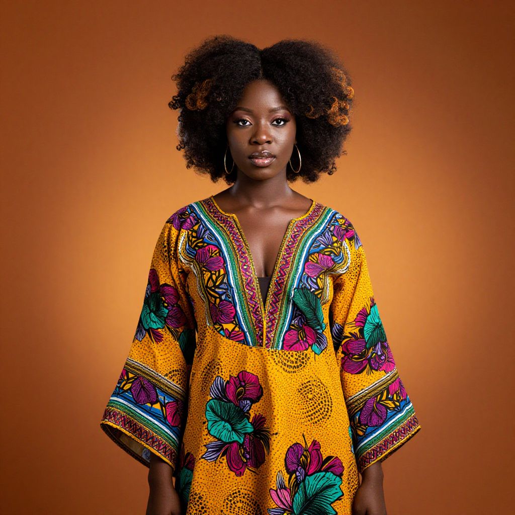 Photograph of a confident Black woman with dark skin and natural, voluminous afro hair, standing against a warm, orange gradient background. She wears a vibrant, yellow, V-neck dress adorned with colorful floral patterns in purple, green, blue, and red, accented with intricate, multicolored embroidery along the neckline and sleeves. Her expression is poised, and she wears large, gold hoop earrings. The dress's fabric appears textured, adding depth to the vivid colors. The overall composition highlights her striking outfit and Afro hairstyle, creating a bold, stylish, and culturally rich visual.