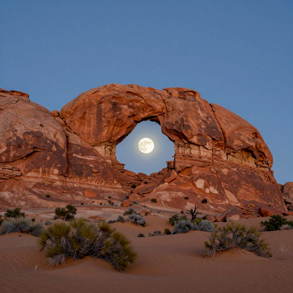 Photograph of a desert landscape with a large, circular rock formation. The formation has an orange-red interior illuminated by a full moon in a clear, starry night sky. Sparse green and gray shrubs cover the sandy ground in the foreground. The rock formation's ure is rough and layered. The moon is centered in the opening of the rock formation.