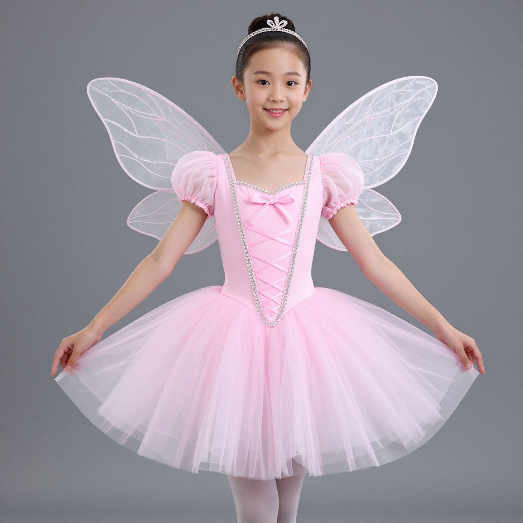 Photograph of an Asian girl in a pink tutu, white wings, tiara, and silver necklace, smiling against a gray background.
