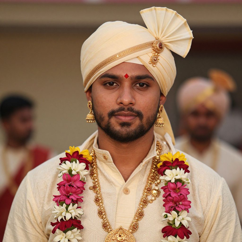 Traditional indian wedding, 1boy, male focus, solo, jewelry, beard, facial hair, earrings, turban, necklace, realistic, dark-skinned male, flower, dark skin, blurry, looking at viewer, blurry background