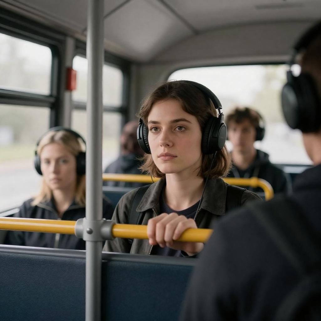 Close-up of a woman with light brown hair in a headset, wearing a fur-trimmed coat and scarf, looking down with an intense expression. Dark, blurry background with green and orange lights.