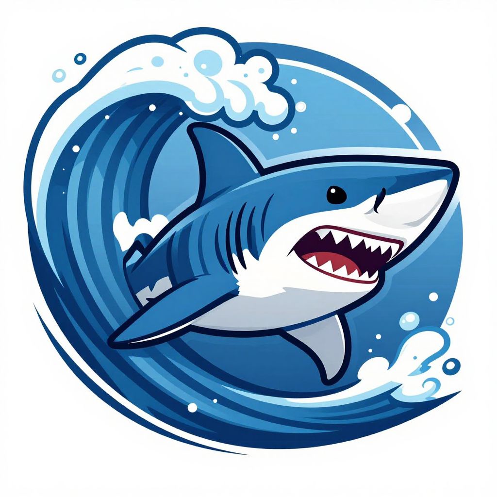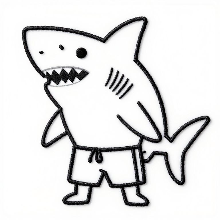 Black-and-white cartoon drawing of a cute, smiling shark wearing shorts, standing upright with a fin, simple lines, and minimal details.
