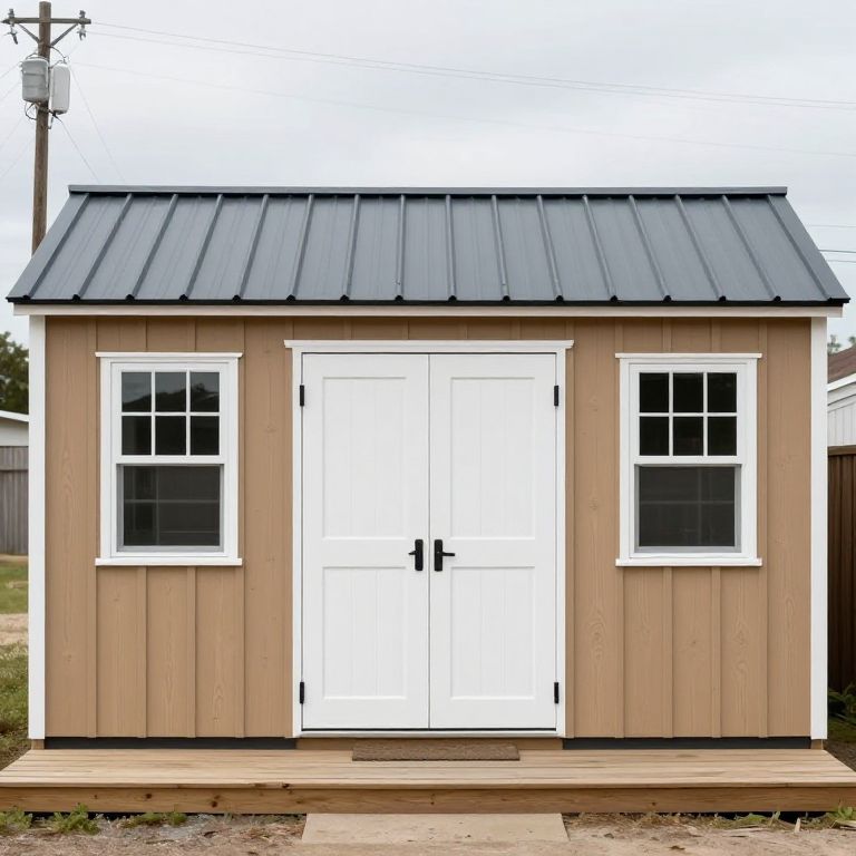 Storage shed featuring a dark gray metal roof, tan wooden siding, white double doors with black hinges, and two windows flanking the entrance, situated outdoors with a wooden platform in front, set against a backdrop of utility poles and overcast skies.
