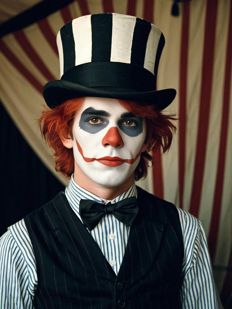 Male circus costume, 1boy, solo, male focus, hat, facepaint, looking at viewer, bow, vest, bowtie, striped shirt, red hair, upper body, striped clothes
