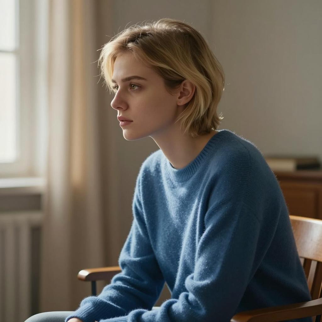 Nude blonde woman with short hair lies on a bed, propped on her elbows, reading a magazine. Her expression is neutral. Background includes a metallic bed frame, a white fan, and blurred objects. She is in a bedroom with green sheets partially covering her lower body. Two people are not present. Natural lighting.