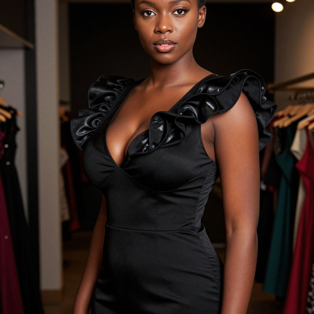 Photograph of a confident, dark-skinned woman with glossy black hair, wearing a black, deep V-neck dress with ruffled shoulders, standing in