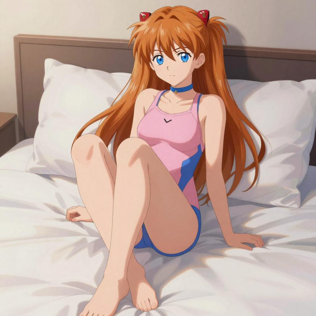 Digital anime-style illustration of Asuka Langley Soryu from Evangelion sitting on a bed. The character has long orange hair tied with ribbons, blue eyes, and wears a pink and blue swimsuit with a matching blue choker. She is barefoot with crossed legs, sitting on white sheets with pillows in a softly lit bedroom setting.