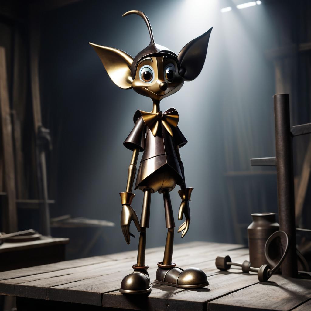 A dark and twisted Pinocchio with metallic sheen, its elongated nose made of jagged metal, standing in a gloomy workshop.
