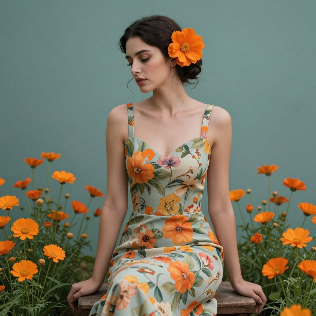 Elegant woman seated amidst vibrant orange flowers, adorned with a matching floral dress and a large bloom in her hair, set against a serene teal background.