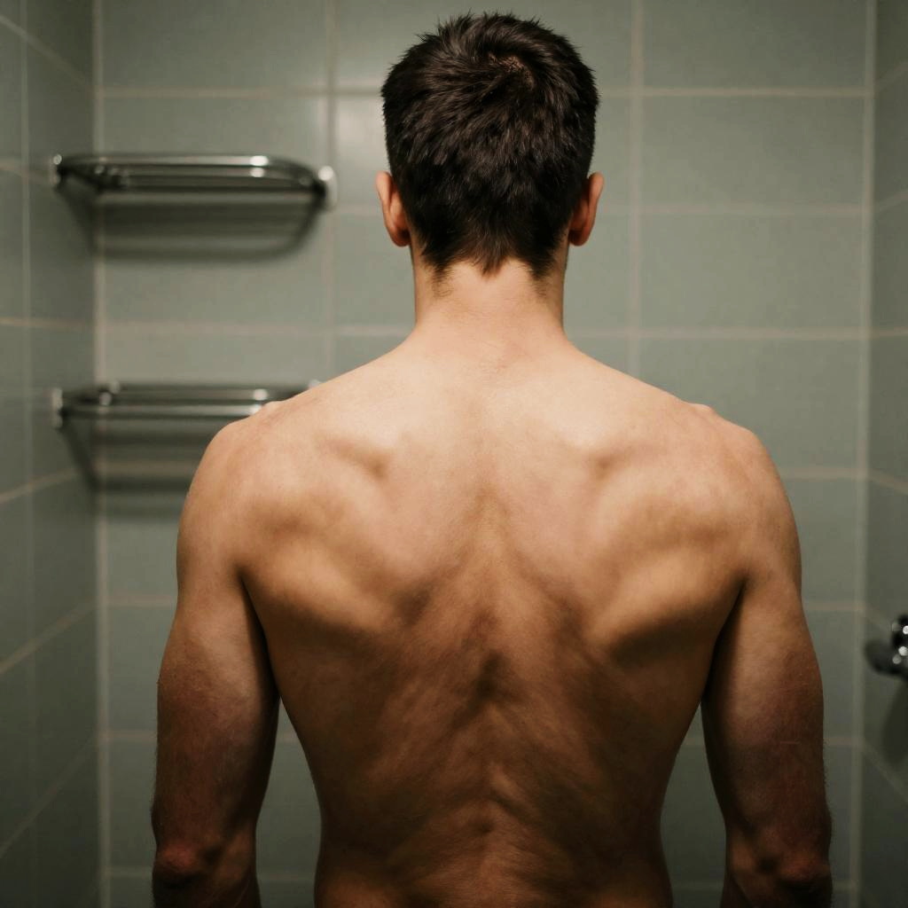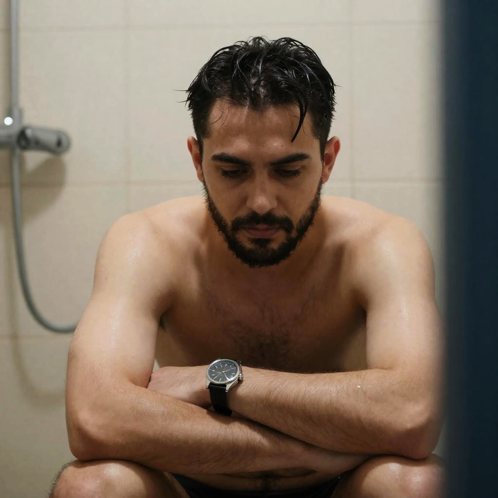 A shirtless man stands barefoot in a dimly lit hallway with green walls. He has a white towel draped over his head and a dark brown towel wrapped around his waist. The hallway features a mounted deer head, shelves with books and pictures, a sink area, and a black coat hanging on a wall hook. Warm ceiling light illuminates the scene.