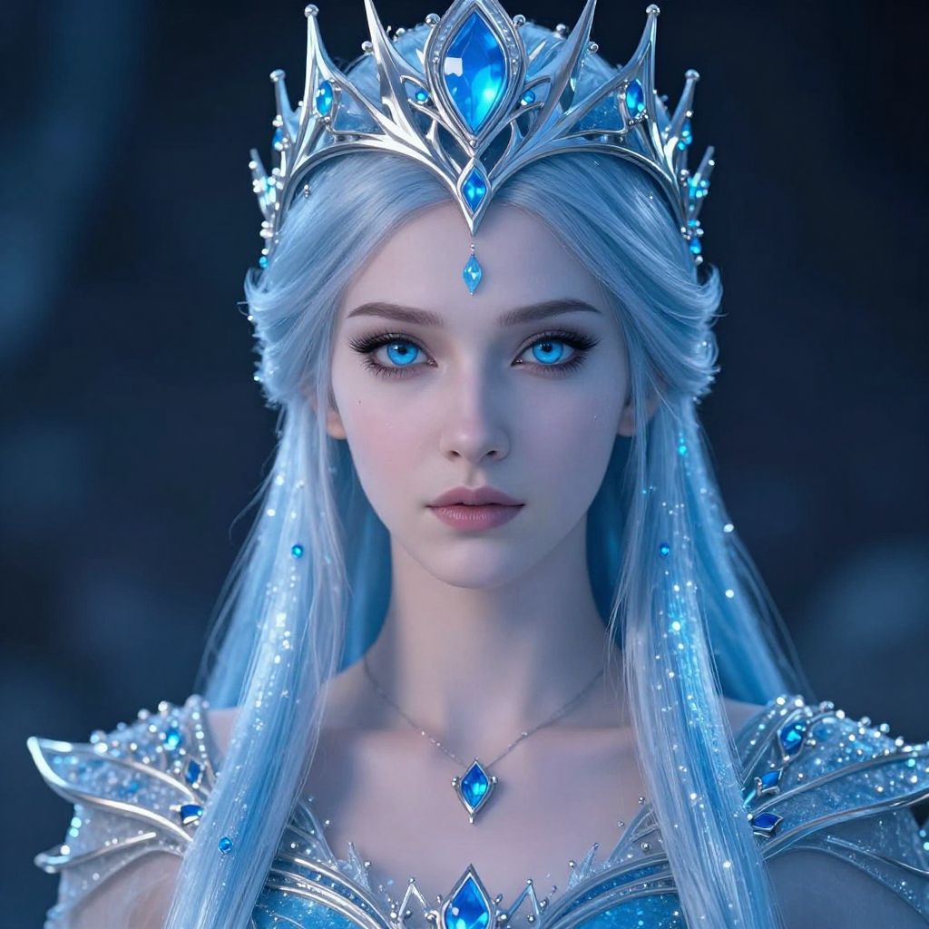 Digital fantasy portrait of a fair-skinned, blue-eyed young woman with long, silver hair adorned with a jeweled, silver crown. Her dress features intricate, sparkling silver armor-like shoulders with blue gemstones. She wears a matching diamond-shaped pendant at her neck. The background is dark and blurred, emphasizing her ethereal, regal appearance. The image has a glowing blue hue, enhancing the magical, otherworldly atmosphere. The woman's expression is calm and composed, with delicate, flawless features and subtle makeup. The style is highly detailed and realistic, typical of modern digital fantasy art.