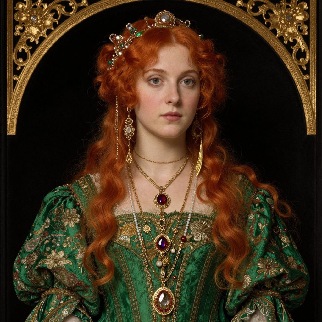 Photographic-style digital painting of a fair-skinned, red-haired woman with long, wavy hair, wearing an ornate, green Renaissance-style dress adorned with gold embroidery and lace. She has a delicate, oval face with light blue eyes, and a slight, serene expression. She wears a jeweled tiara, long gold earrings, and multiple layered gold necklaces with large, oval red gemstones. The background is black, and she is framed by an intricate, gold-arched design with floral patterns. The overall style is regal and opulent, reminiscent of a royal portrait.