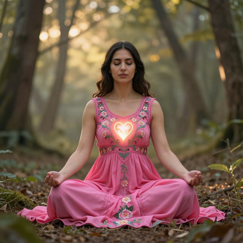 Photograph of a dark-haired woman in a pink floral dress, sitting cross-legged in a forest, meditating with a glowing heart on her chest.