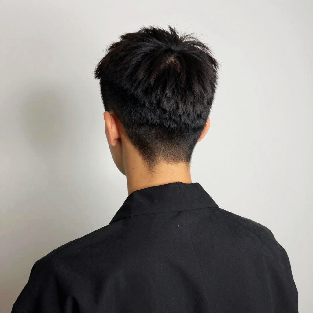 Crewcut on a fashion-forward individual wearing avant-garde clothing, minimalist studio background, soft diffused lighting, high contrast shadows emphasizing sharp haircut details, contemporary art style