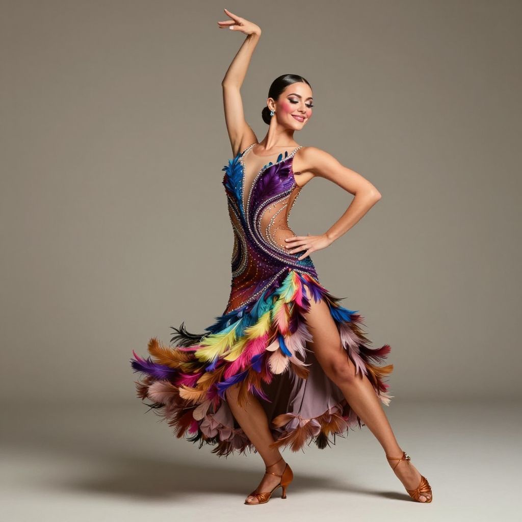 (8k, best quality, masterpiece, ultra highres:1.2), 1 Swan, full body, beautiful wearing a colorful tango dance dress, feather dress, Latin dancing dress, smile, blush, tight body, fit body, official art, ultra high res, professional photography, sharp focus, HDR, 8K resolution, intricate detail, sophisticated detail, depth of field, analogue RAW DSLR, photorealistic