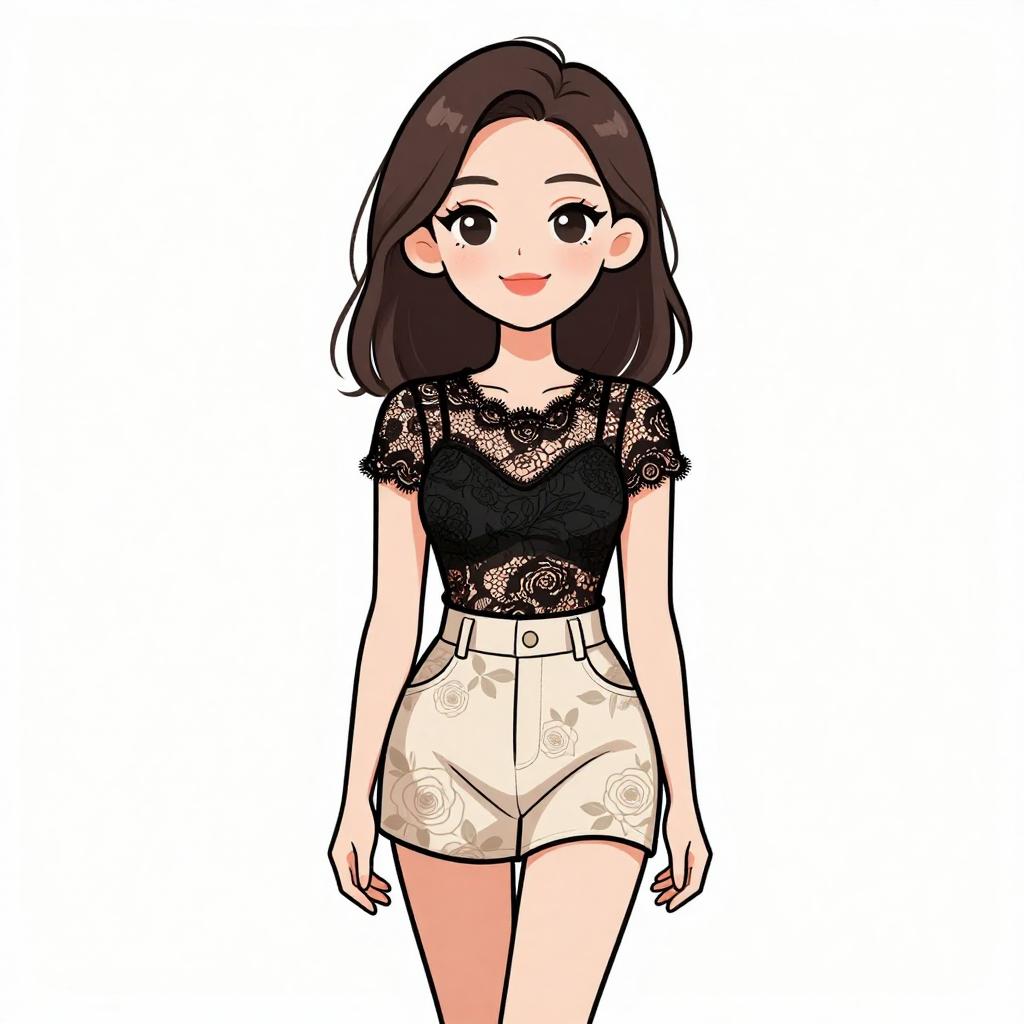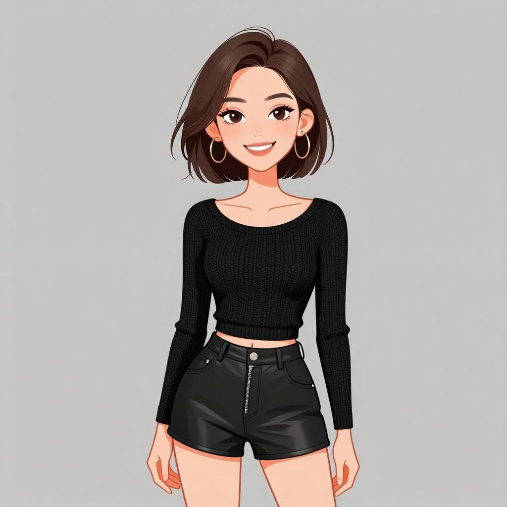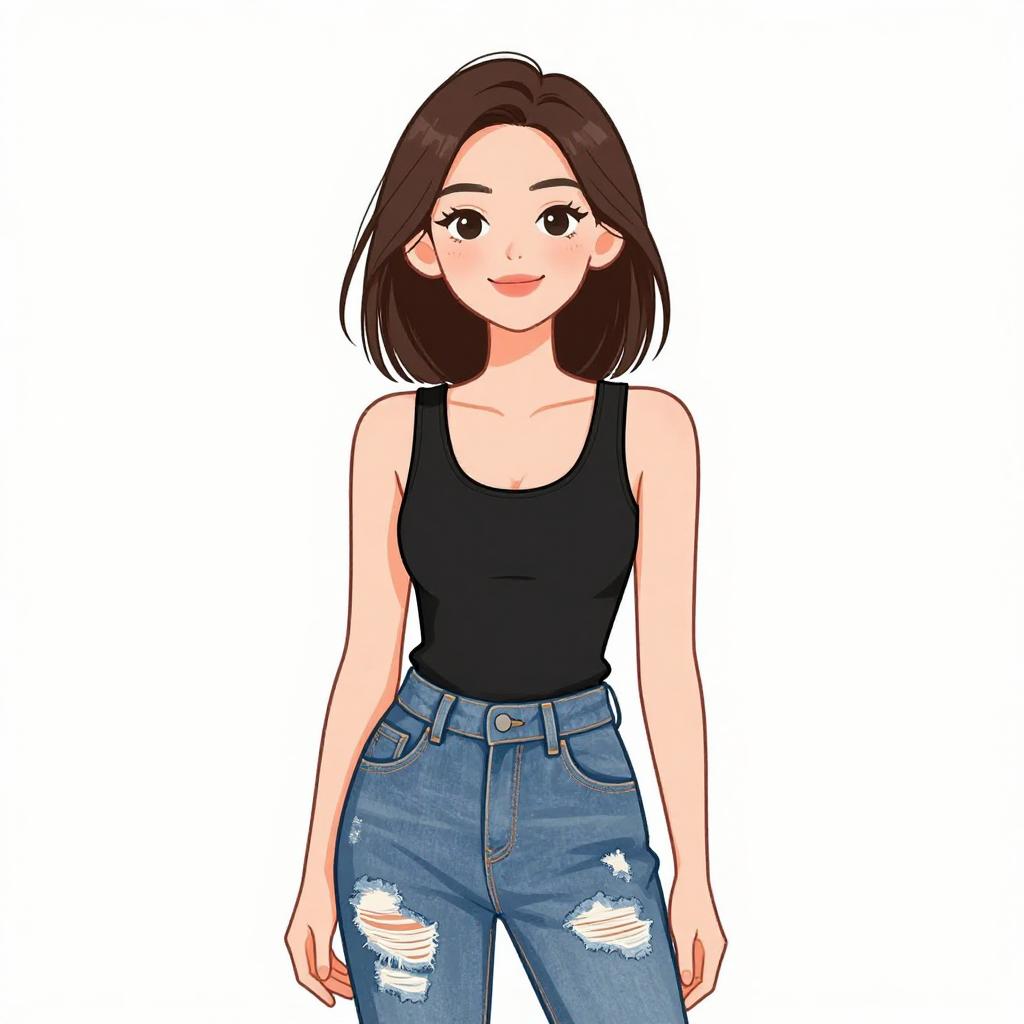 Woman with pretty face and pretty hair. smiling Woman, edgy, black lace corset top with sweetheart neckline, sleeveless, distressed blue skinny jeans with ripped knees, black leather jacket over one shoulder, thin black choker, minimal makeup. --sref 1467