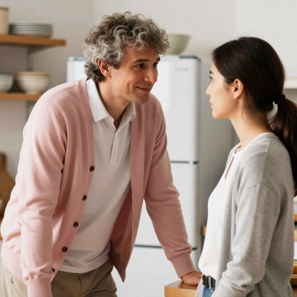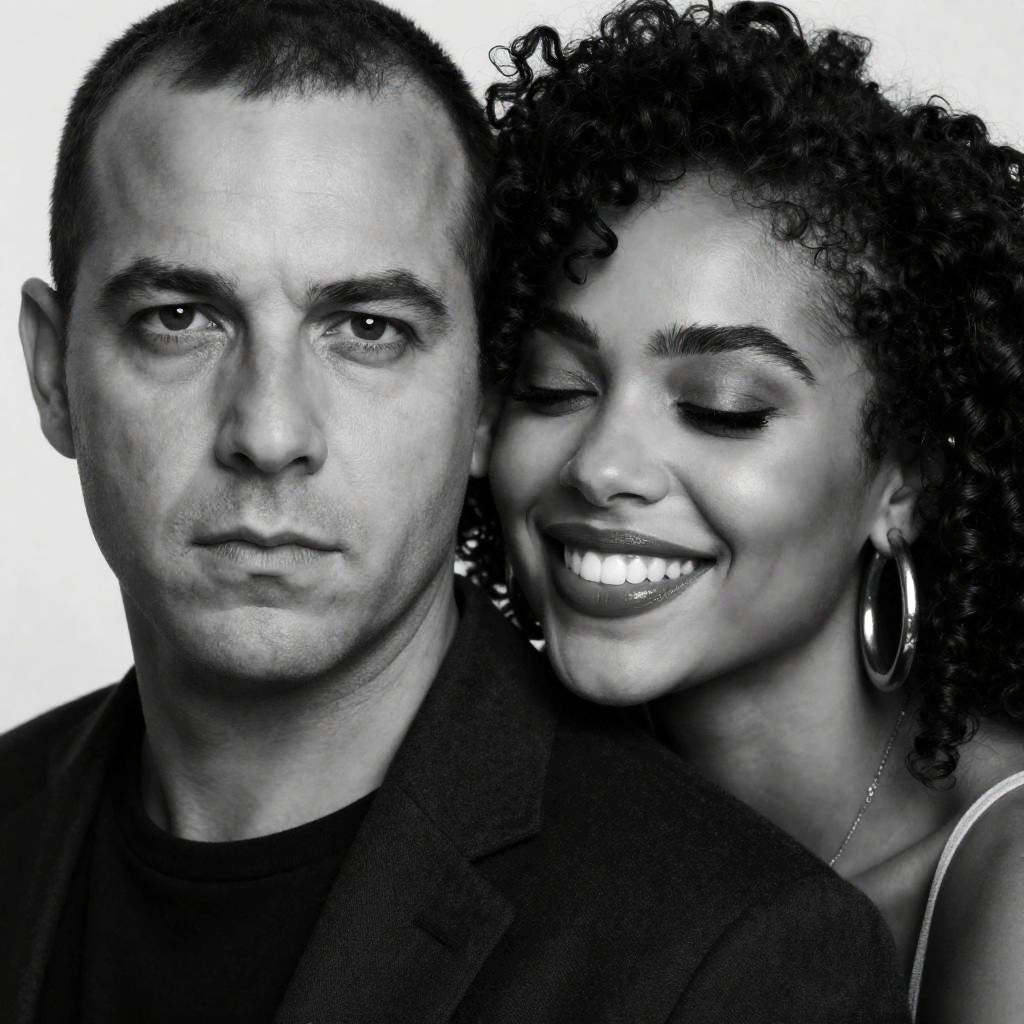 Photograph of a young woman with short, curly hair, light skin, and a neutral smile beside a close-up of a serious older man with graying hair and rugged features. Both wear tank tops. Yellow-tinted background. Woman on left, man on right.