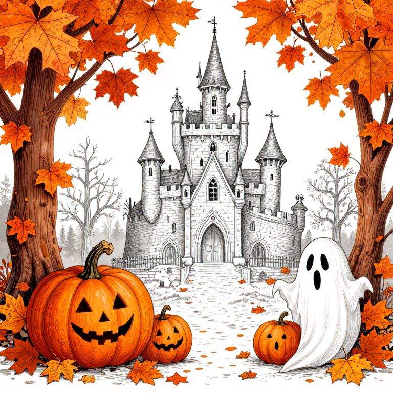 Angles autumn leaves, pumpkins, ghosts, spooky and orange, haunted castle, cottagecore aesthetic, line art, drawing, witchy, hyperdetail, maximum detail, neo traditional drawing style –v4,