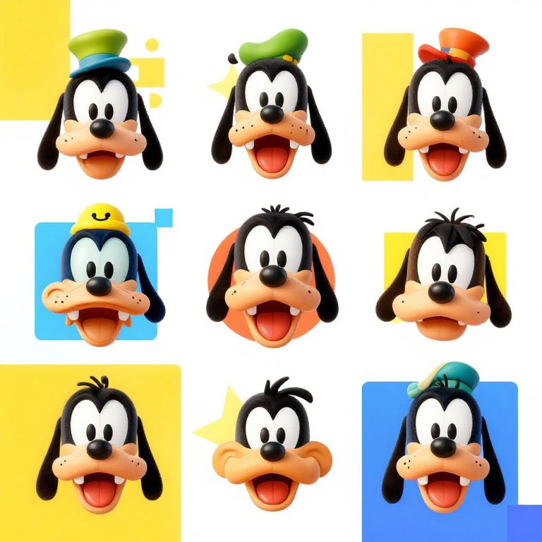 Bright, colorful digital illustration of nine Goofy cartoon dog faces, each with unique hats, expressions, and backgrounds, arranged in a 3x