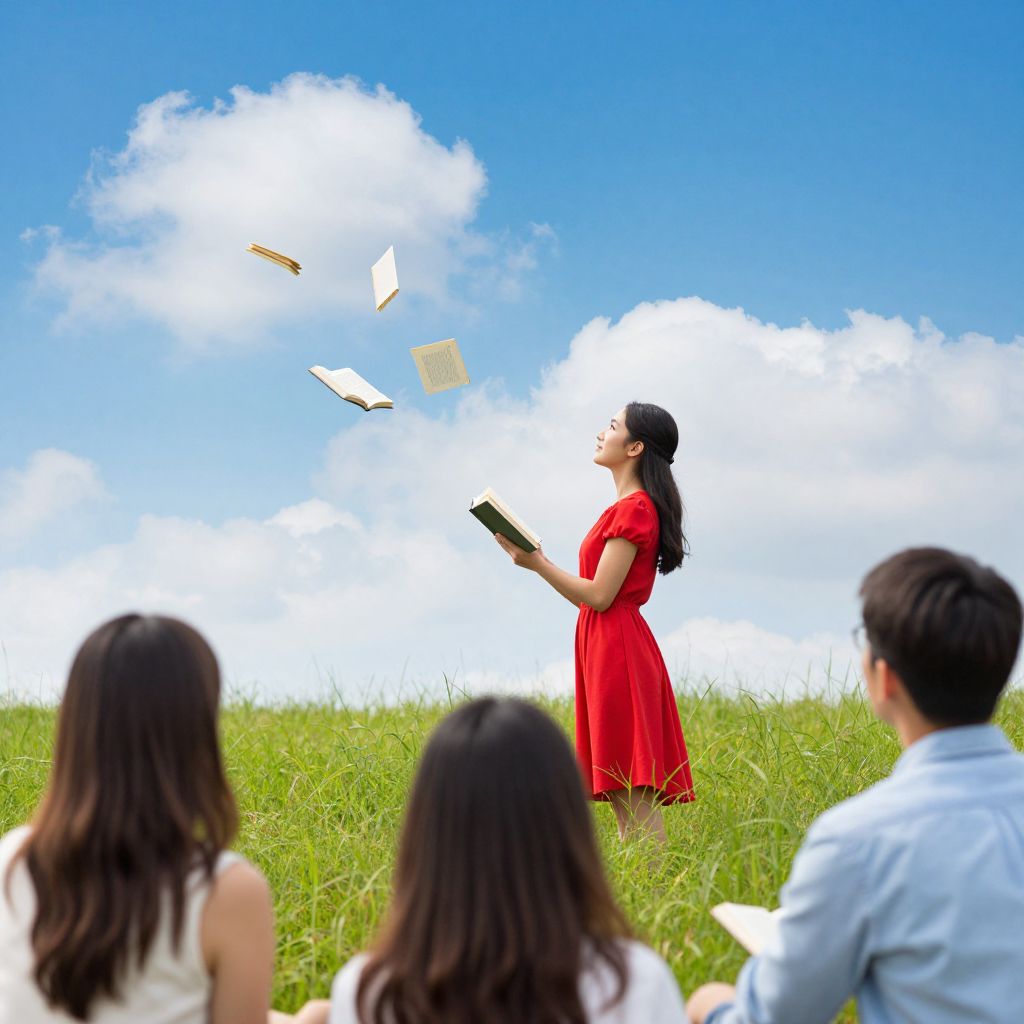 Photograph of an Asian woman in a red dress, standing on a grassy hill, magically making books float in a blue sky with white clouds,