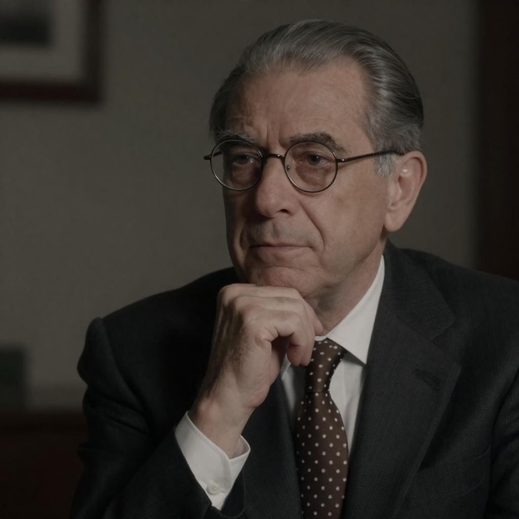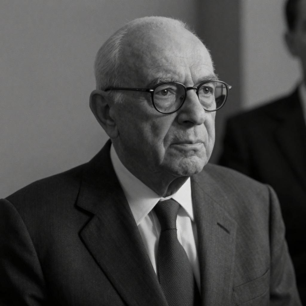Black-and-white photograph of an older man with short, dark hair, wearing glasses, a ured suit jacket, white shirt, and patterned tie. He stands against a blurred background of bookshelves. His expression is serious, and he is slightly smiling. The image has a grainy ure.