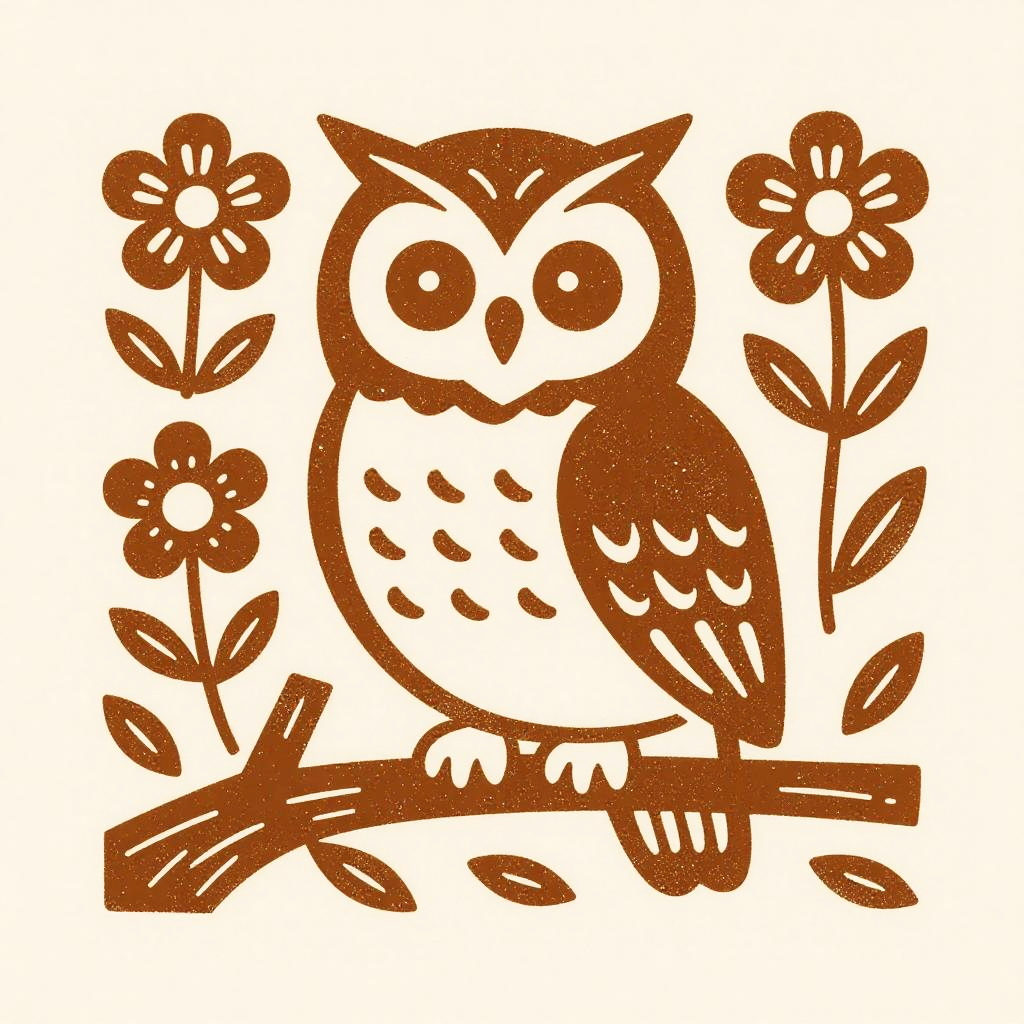 A detailed woodcut print-style illustration of an owl perched on a branch with stylized flowers around it, rendered in folk art linocut style, featuring rustic textures and minimalistic design, warm brown and cream color palette, vintage aesthetic