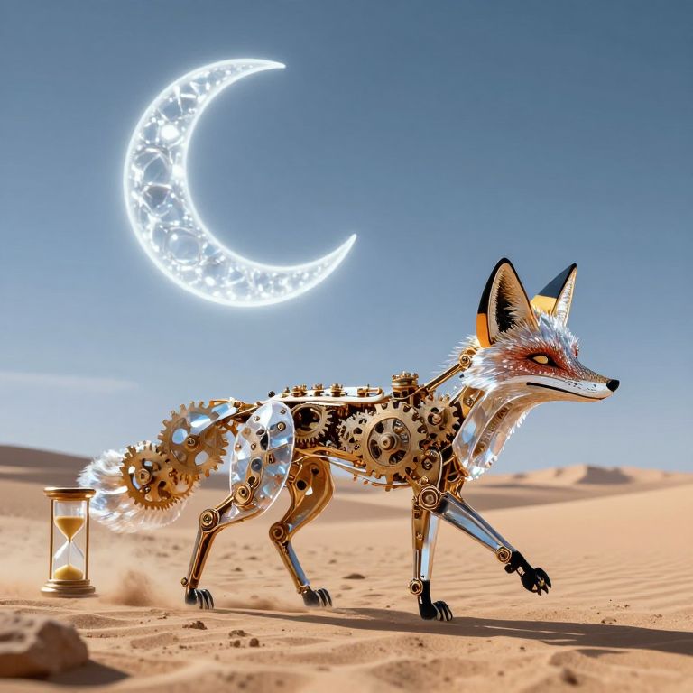 Digital artwork of a mechanical fox with gears and cogs, standing in a desert under a glowing crescent moon, beside a sand-filled hourglass.