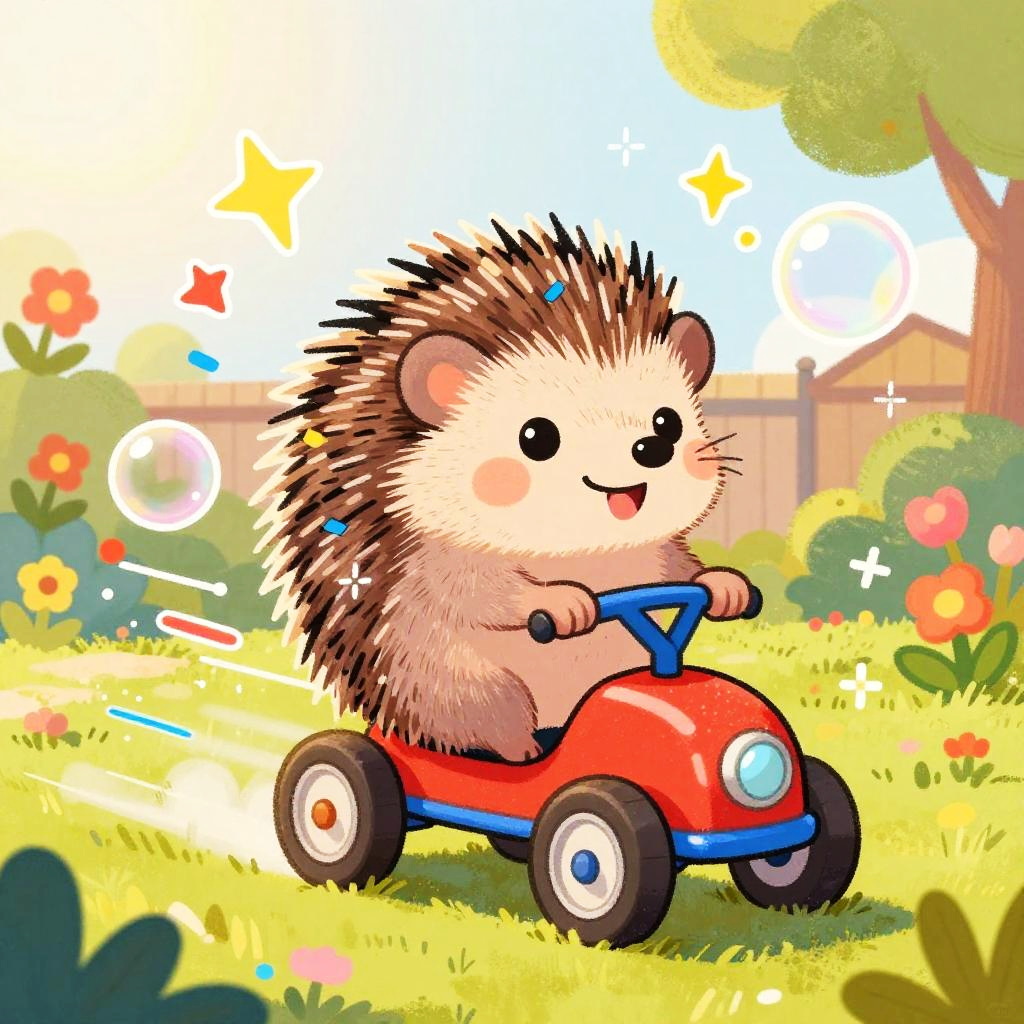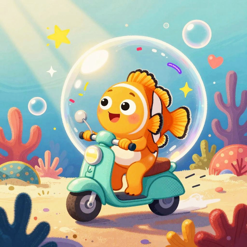 Playful children's illustration of jovial tiny coral reef fish, confidently riding a sparkling turquoise bubble scooter through colorful underwater coral garden with sunlight beams, confetti doodles, sparkles, and bubble shapes swirling; dynamic pose with speed lines, chunky marker outlines, bold crayon and gouache strokes, retro halftone accents; big curious eyes, warm golden light, sticker stars and hearts, saturated candy colors, joyful motion; friendly, kid-safe, perfect for a picture-book cover, high resolution, clean background, hand-drawn feel, soft textures, inviting storytelling vibe