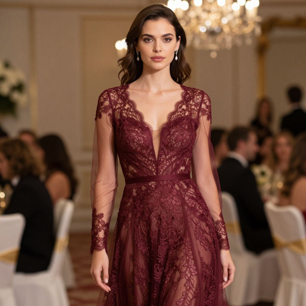 Elegant woman wearing a wine-red lace evening gown with transparent long sleeves and a V-neck design, exuding sophistication at a formal banquet or prom event.