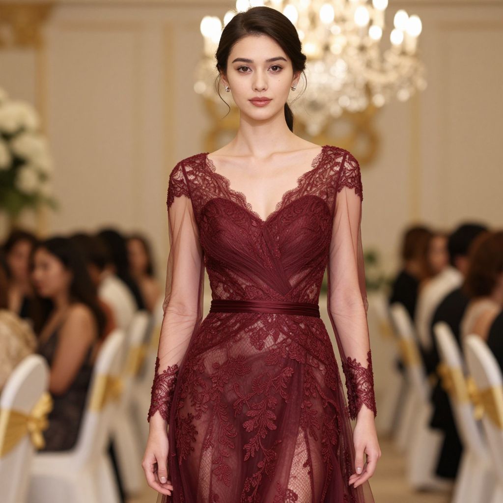 Photograph of a young woman with fair skin and dark brown hair in an elegant updo, walking down a fashion runway. She wears a deep burgundy lace dress with long sheer sleeves, a deep V-neckline, and a fitted waist. The dress features intricate floral lace patterns. In the blurred background, there are seated audience members in black and white attire, with gold sashes on their chairs, and a chandelier overhead. The setting is a luxurious, well-lit hall with cream-colored walls. The woman's expression is calm and confident.