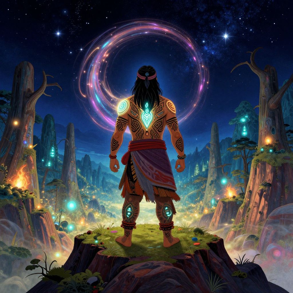 Satashi, a mystical shaman adorned with glowing tribal tattoos, standing on a cliff overlooking a glowing enchanted forest under a starry night sky, swirling magical energy surrounding them, rendered in a fantasy art style with rich colors and intricate details.