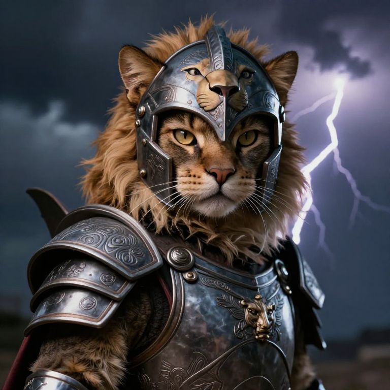 Close-up of a cat wearing armor with detailed engravings and a helmet shaped like a lion's head, dark stormy sky and lightning illuminating the powerful stance, sharp eyes full of determination, cinematic fantasy portrait with dramatic lighting.