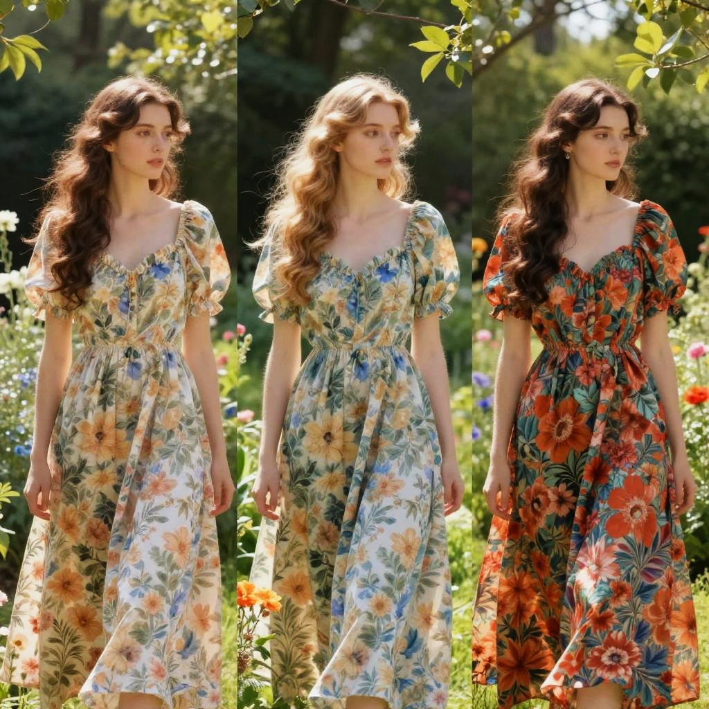 Scantilly clad women with vibrant floral patterns on fabrics, lush garden setting, sunlight filtering through trees, whimsical and surreal elements, painterly textures, elegant mood
