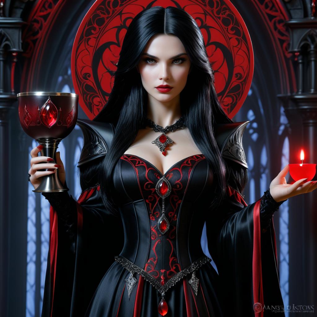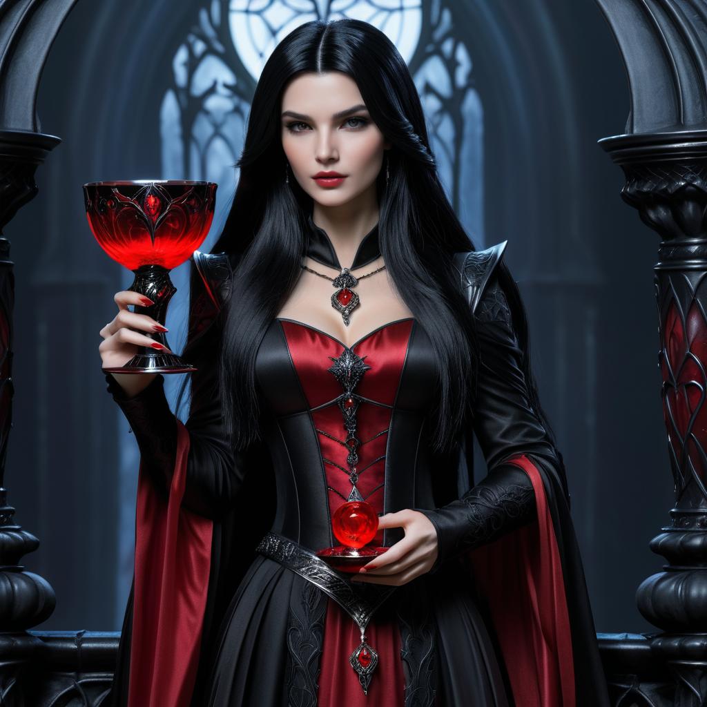 Beautiful vampire with long black hair holding a crimson chalice, set in a dark fantasy world. Styled in high detail by Anne Stokes.