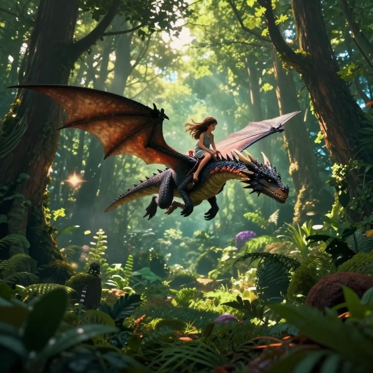 Girl riding a giant green insect with orange wings through a misty forest, surrounded by lush foliage and flying alongside three other similar insects.